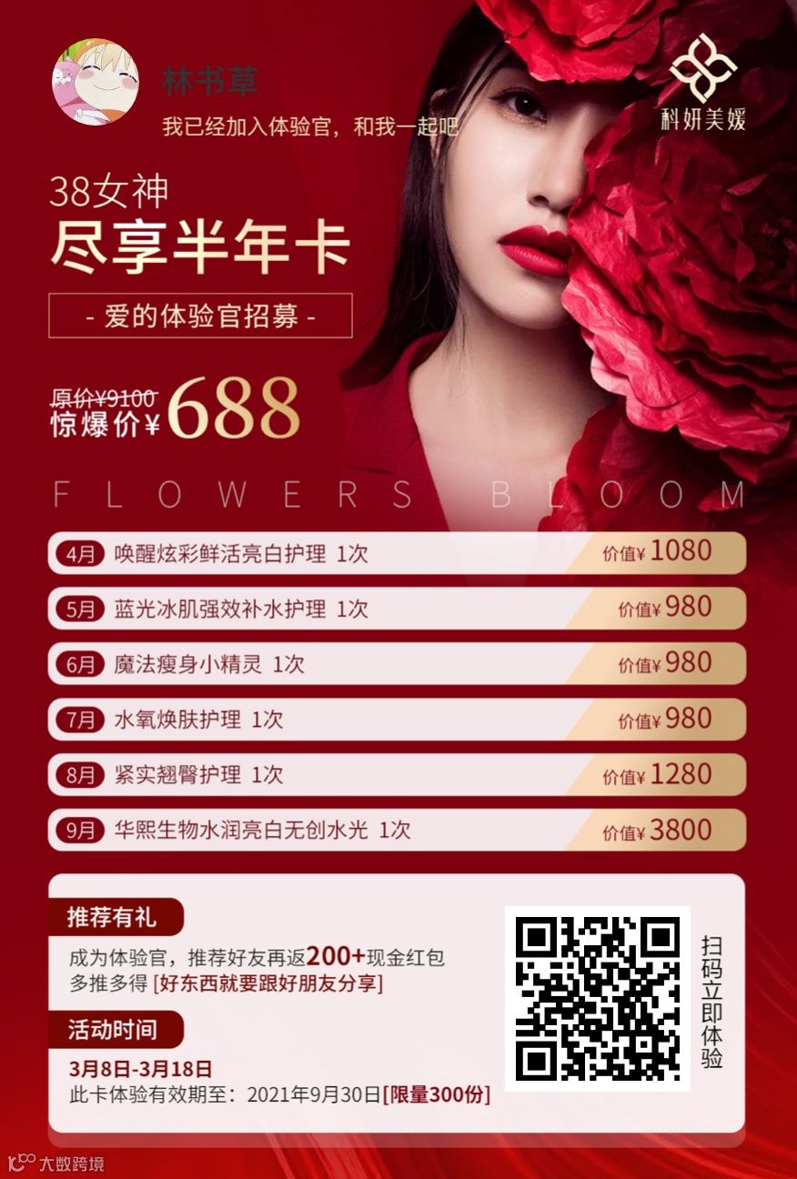 【营销策略】:借势38女神节日营销,推出688元半年卡-爱的体验推荐官活动。成为推荐官,分享1位人下单直返206元现金、分享2人,返现412元为奖励的利益点,吸引店铺高粘性会员成为这次裂变种子用户,将活动海报转发至微信好友、朋友圈,门店内张贴活动海报,线上线下结合引导客户下单。
