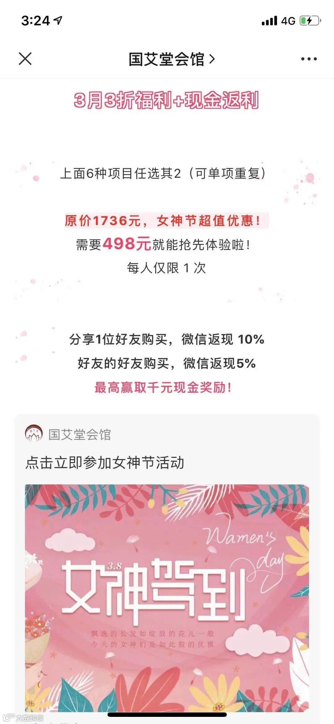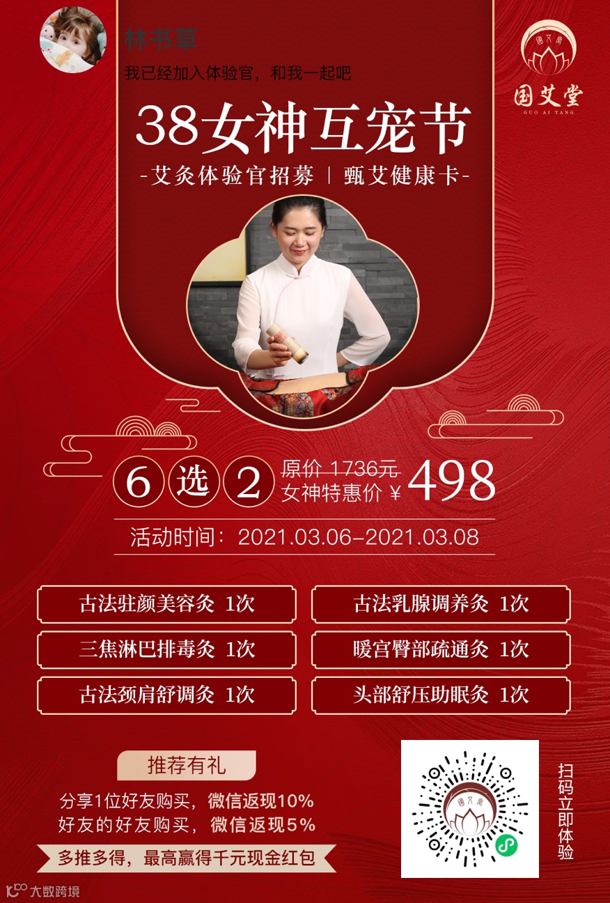 【营销策略】:借势38女神节日营销,推出498元艾灸体验官招募活动,突出成为推荐官好友下单直返10%现金奖励的利益点,激励员工将活动海报转发朋友圈和客户,吸引高粘性会员成为这次裂变种子用户。
