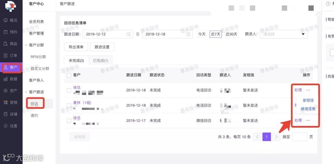 ↑有赞美业会员回访操作后台↑