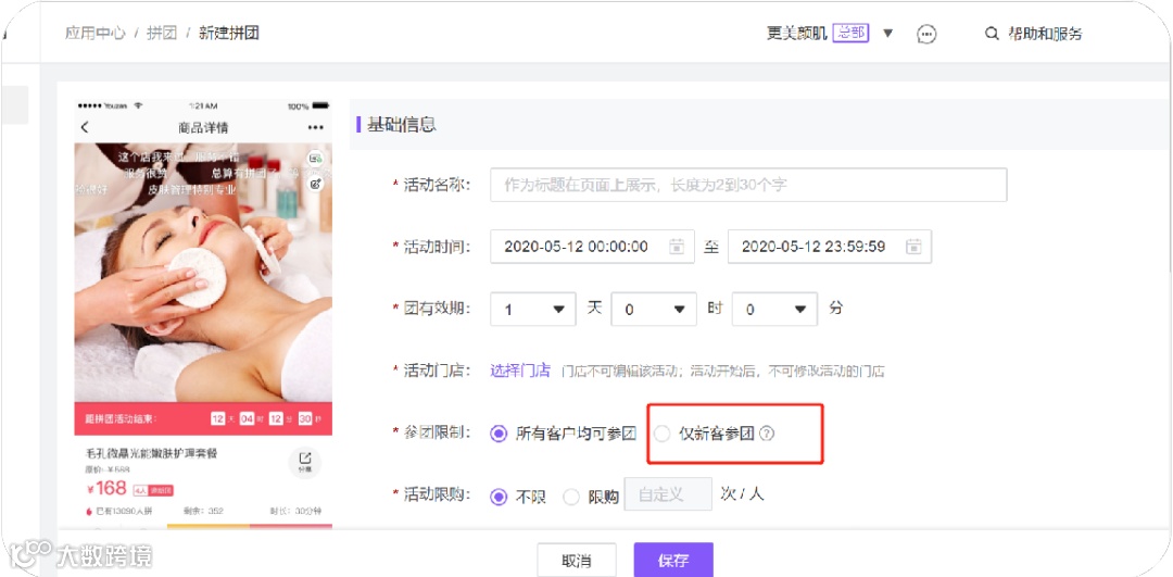 新客只在系统里面没有一次有效消费记录的顾客和从未注册过网店的用户。仅限新客参团,就是新客只能参与老客开的团无法自行开团。