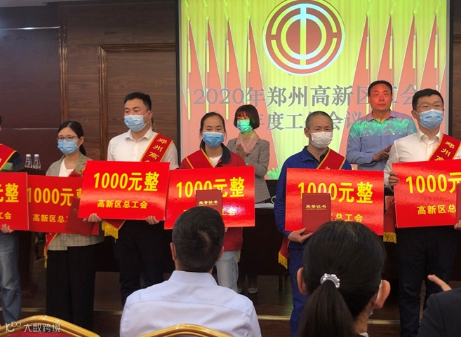 5月8日上午, 2020年郑州高新区工会年度工作暨表彰大会召开。郑州高新区党的建设和社会管理、信访稳定工作领导小组副组长兼办公室主任赵毅,高新区工会主席王桂丽,高新区党群工作部党支部副书记郭广立及高新区各基层工会、企事业工会代表及获奖先进个人参加会议,高新区机关工会主席郭五香主持大会。集团公司优秀工会干部、先进个人参加会议。