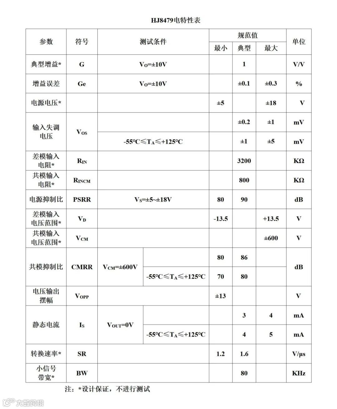HJ8479的设计原理与AD8479类似,都是通过电阻网络的比例设计来达到增大输入共模电压范围。航晶借鉴之前研制差分放大器的成熟经验,对电阻网络中电阻材料、阻值及比例的选择进行了优化设计,使HJ8479选择的电阻比AD8479的选择更优、可靠性更高。