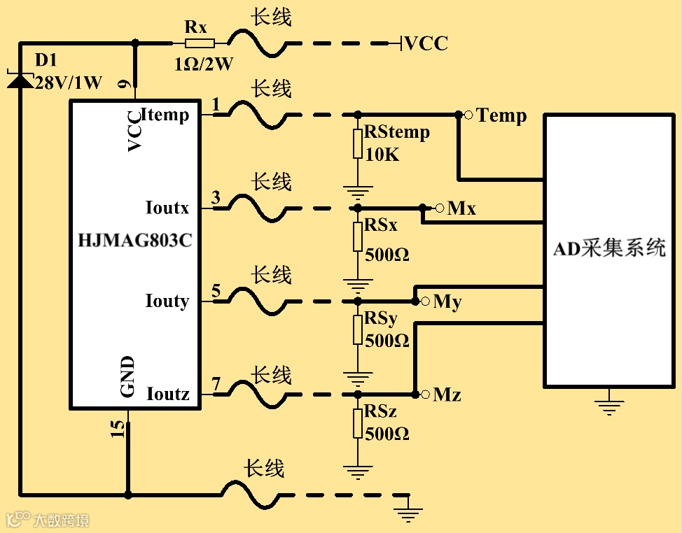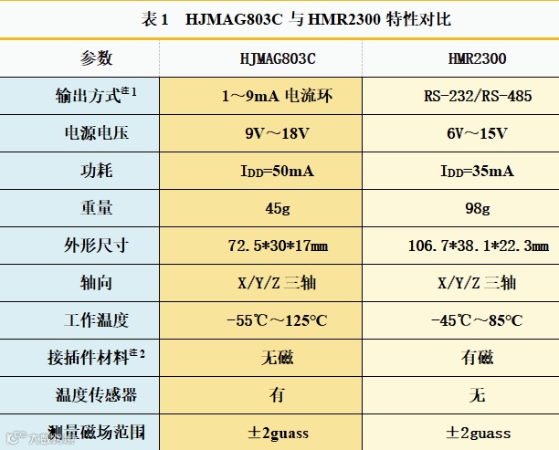 注1:HMR2300软件控制采用非隔离的RS-232/RS-485接口芯片,容易受远端地线的共/差模干扰产生误码,严重时会损坏其中的收发器。客户使用时,需要对内部软件进行认证和兼容设计。而HJMAG803C内部无需编程,输出1~9mA电流信号,相较于内部编程的HMR2300使用更加方便,具有输出带长线、高信噪比、高精度等特点。