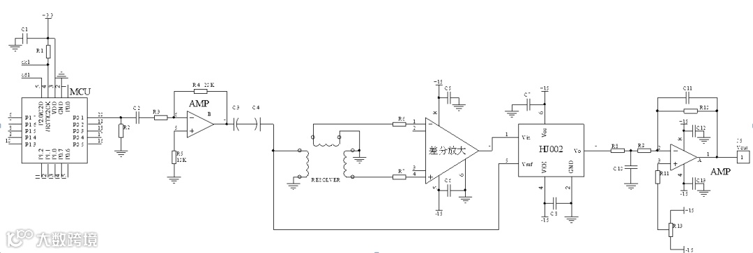 HJXXX旋变激磁解调电路主要由DDS发生器、功率驱动、差分放大、相敏解调、低通滤波组成,原理图如下: