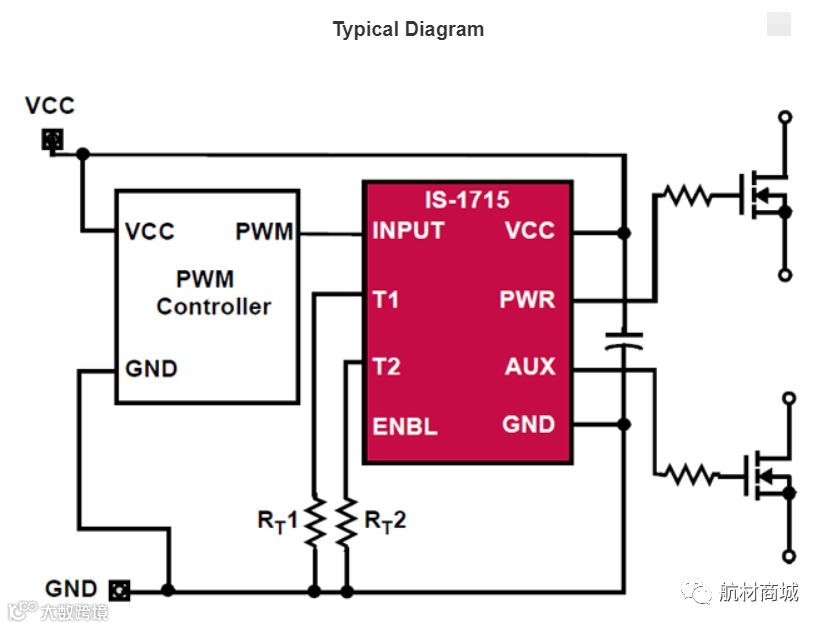 IS-1715ARH和IS-1715AEH有一个单一的输入,它是PWM和TTL兼容的,并且可以在1MHz的频率下运行。AUX输出立即切换在输入的上升沿,但等待T2延迟之前,响应下降沿。使能引脚(ENBL)上的逻辑低电平将两个输出置于有源低模式,并且欠电压锁定(UVLO)功能设置为9V(最大)。