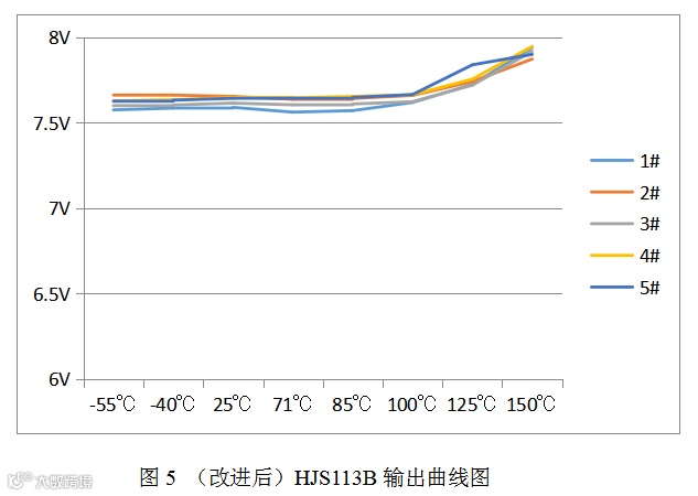 将5块HJS113B器件分别编号1#2#3#4#5#,后按照图3所示线路连接。经实验测试,HJS113B器件在-55℃~+150℃条件下输出幅度数据记录见表1所示,数据处理曲线见图4所示。
