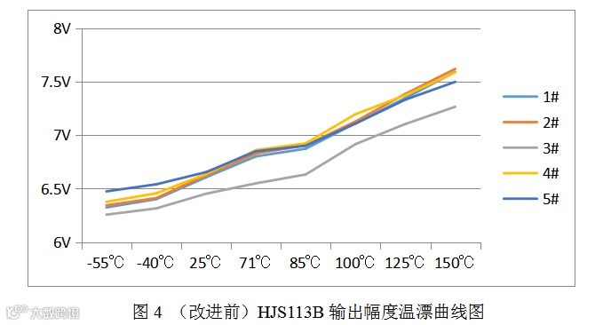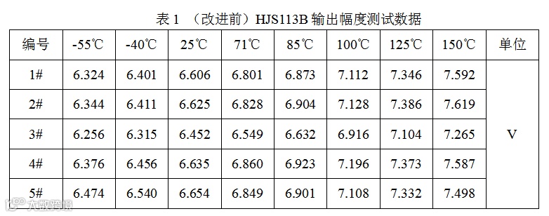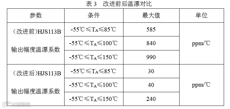 通过表2及曲线图5可知,改进后的HJS113B在-55℃~150℃区间内温漂系数较小,相对于改进前器件的输出幅度温漂有明显改善,其对应的温度区间内温漂系数如表3所示。