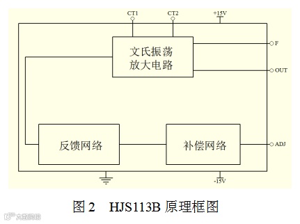 HJS113B是一种AGC型文氏电桥振荡电路,实物图如图1所示,包括两个高性能运算放大器、两个精密低温漂时基电阻(10 kΩ)、一个精密基准电压源、整流元件、JFET可变电阻和积分器等。利用RC串并网络的选频特性和正反馈而产生正弦波,具有波形失真小、输出信号幅度稳定和频率调整方便等优点。器件由改进的厚膜集成电路工艺制成,提高了器件在高温环境下长期使用的可靠性。