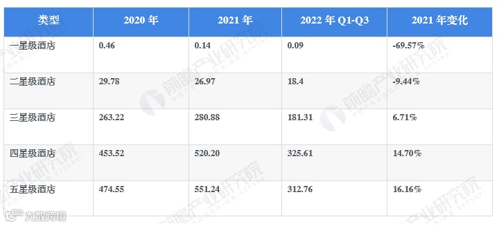 2021年,从不同星级酒店的营收规模变化看,一星级和二星级酒店2021年营收较2020年分别下降69.57%和9.44%;三星级及以上酒店营收均增长,其中五星级酒店2021年营收达到551.24亿元,较2020年增长16.16%,在三星级及以上酒店中增长最快。