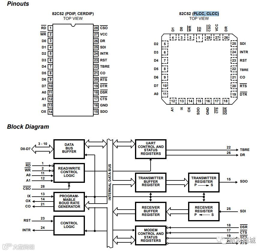 MD82C52/7是intersil生产的一种高性能可编程通用异步收发器(UART)和波特率发生器(BRG)在一个芯片上。利用Intersil高级缩放Saji-IV CMOS工艺,82C52将支持数据速率高达1M波特与16X时钟(16MHz时钟频率)异步。