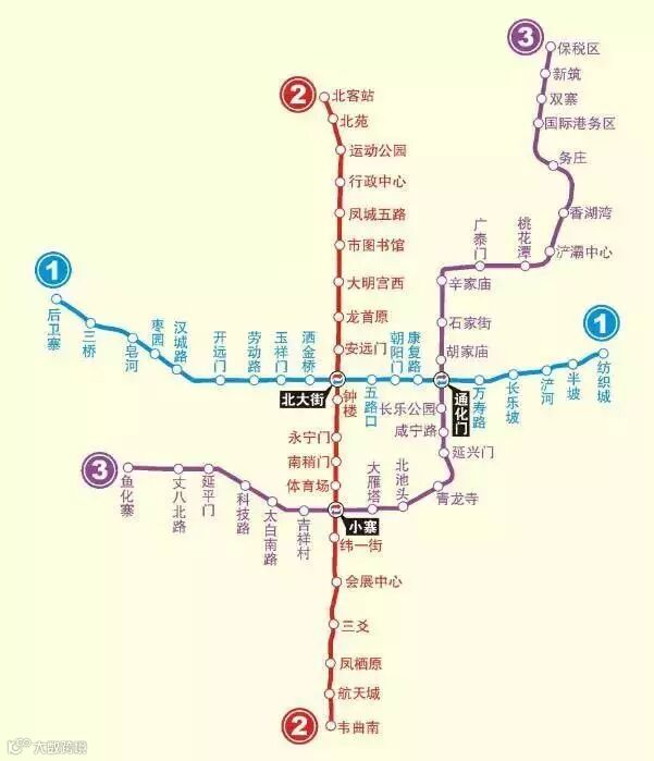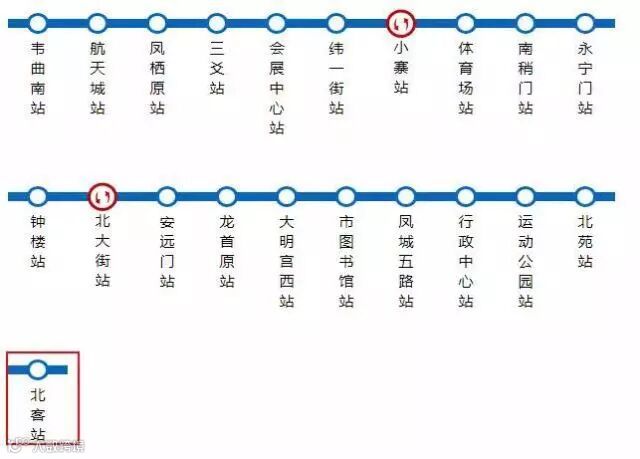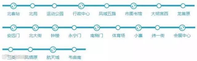 北客站—北苑—运动公园—行政中心—凤城五路—市图书馆—大明宫西—龙首原—安远门—北大街—钟楼—永宁门—南稍门—体育场—小寨—纬一街—会展中心—三爻—凤栖原—航天城—韦曲南