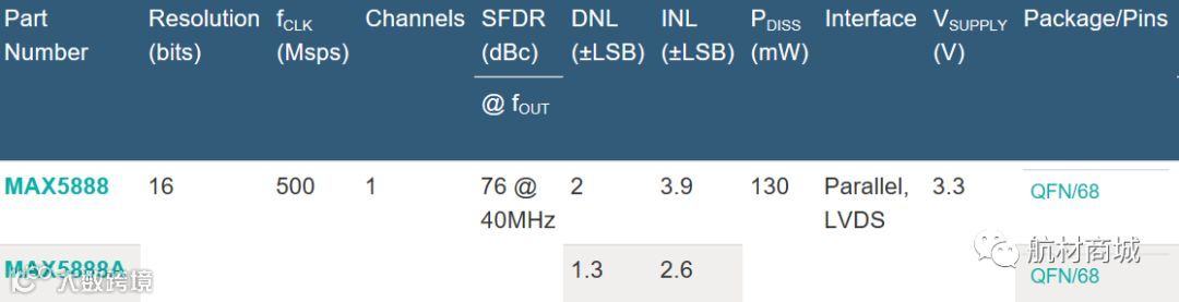 MAX5888是先进的16位、500Msps数模转换器(DAC),设计用于满足要求性能苛刻的信号合成应用,如无线基站和其它通讯应用。该DAC工作于3.3V单电源,提供无以伦比的动态性能,如76dBc的无杂散动态范围(SFDR) (fOUT = 40MHz时)。该DAC支持500Msps的更新速率,且功耗小于250mW。