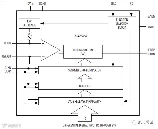MAX5888采用电流导引结构,该结构支持满量程输出电流范围2mA至20mA,允许差分电压输出摆幅在0.1VP-P至1VP-P之间。