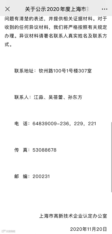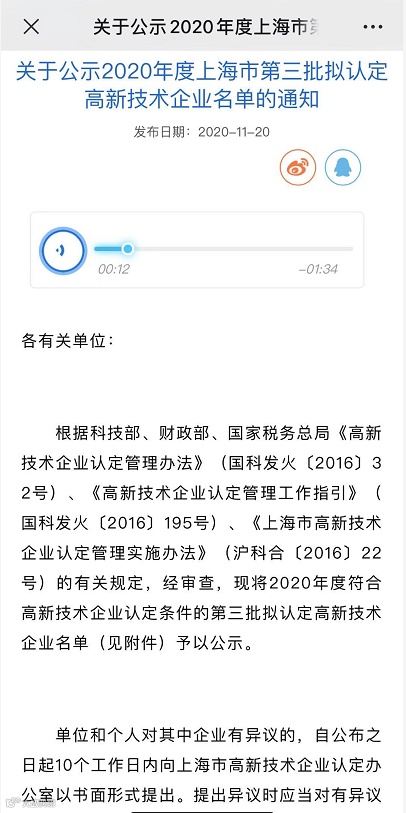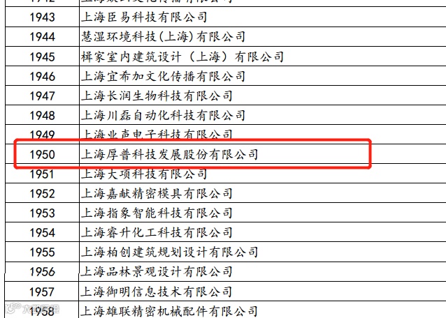 2020年11月20日上海市科学技术委员会发布的《关于公示2020年度上海市第三批拟认定高新技术企业名单的通知》文件中,上海厚普科技有限公司获得上海市高新技术企业拟认定。