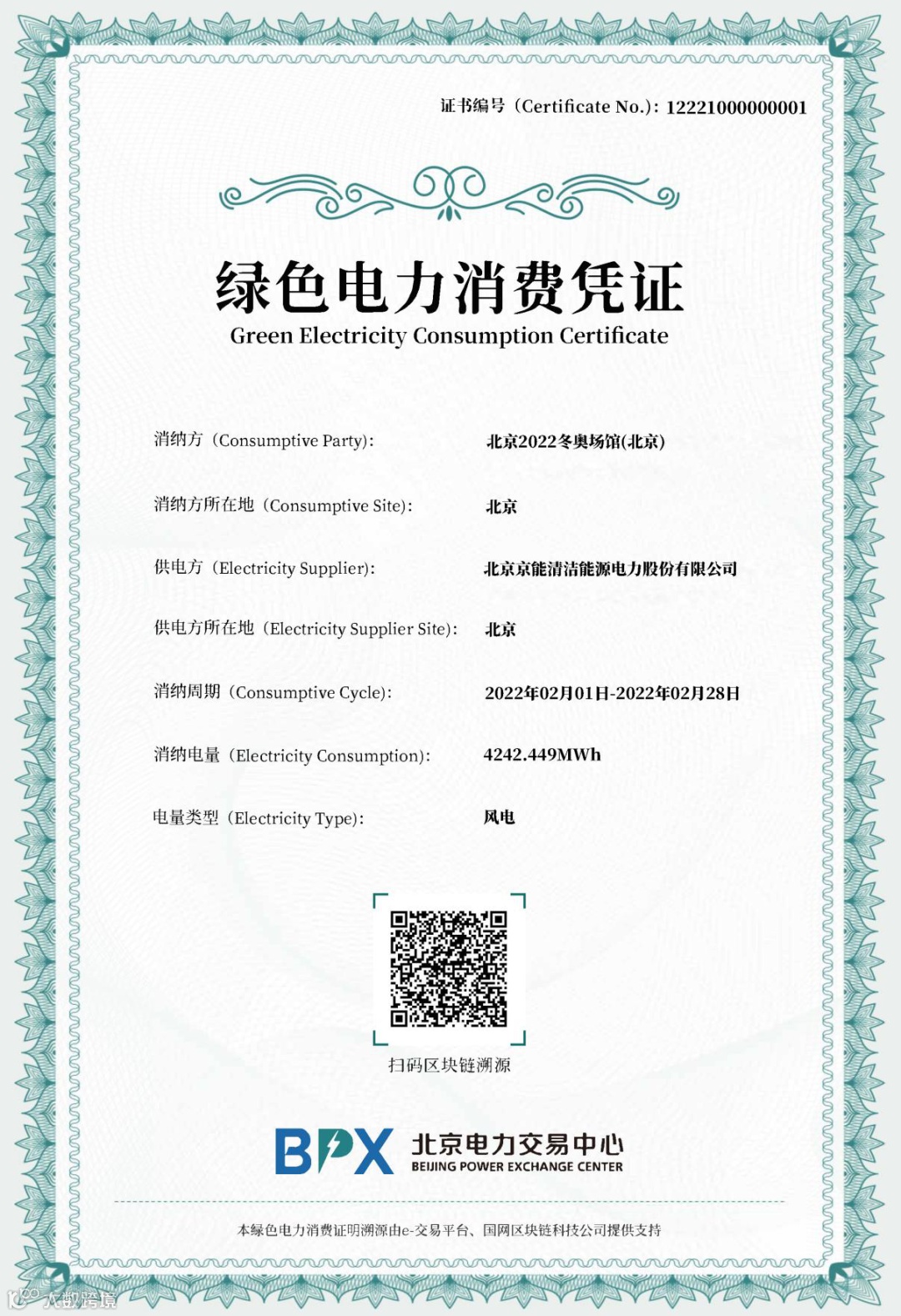 2022年4月26日上午,在国家发展改革委、国家能源局等政府主管部门和发电集团、电力用户代表等市场主体参加的电力市场管理委员会会议上,北京电力交易中心向北京2022年冬奥会和冬残奥会组织委员会正式颁发国内首张绿色电力消费凭证。绿色电力消费凭证的正式发放,标志着国内绿色电力消费得到权威认证,能够有效引导全社会形成主动消费绿色电力的共识,激发供需双方潜力,加快绿色能源发展,推动我国能源清洁低碳转型。同批发放的绿色电力消费凭证共计168个,对应绿色电量10317万千瓦时,涉及9家电力用户、25家新能源发电企业。