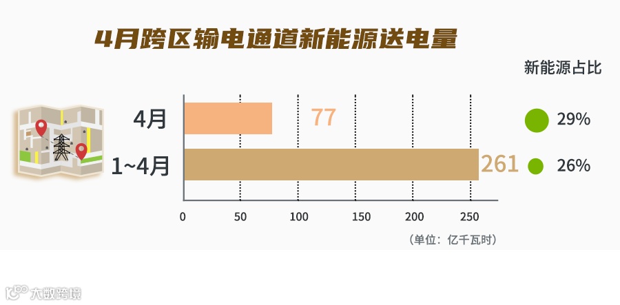 4月,通过天中、祁韶、灵绍、鲁固、高岭等跨区通道组织西北、东北地区新能源送华北、华东、华中电量77亿千瓦时,输电通道新能源占比29%。1~4月,通过天中、祁韶、灵绍、鲁固、高岭等跨区通道组织西北、东北地区新能源送华北、华东、华中累计电量261亿千瓦时,输电通道新能源占比26%。