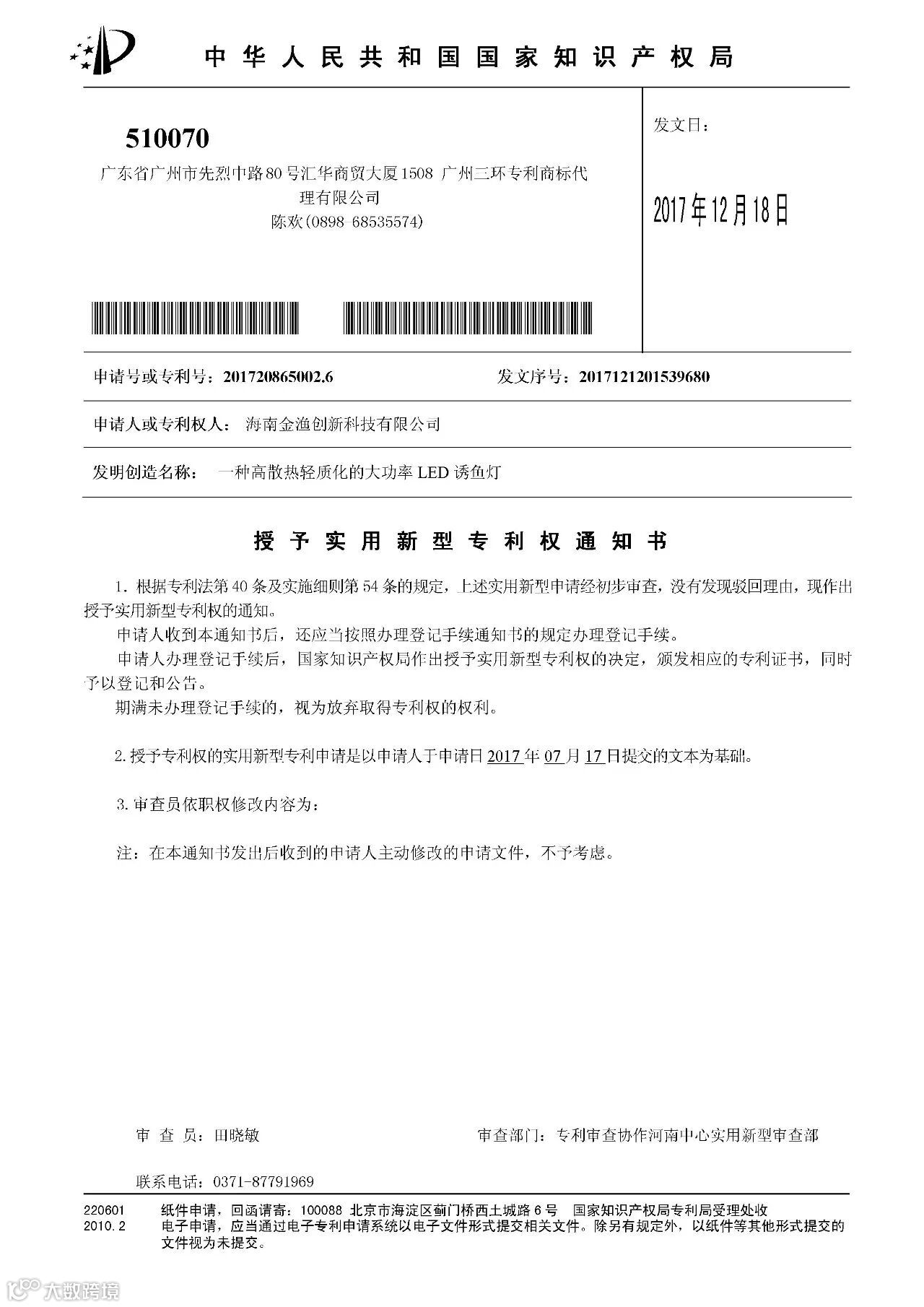 喜大普奔!!在迎接2018新年之际,海南金渔创新科技有限公司再传来喜讯,获得了由国家知识产权局颁发的两项专利证书