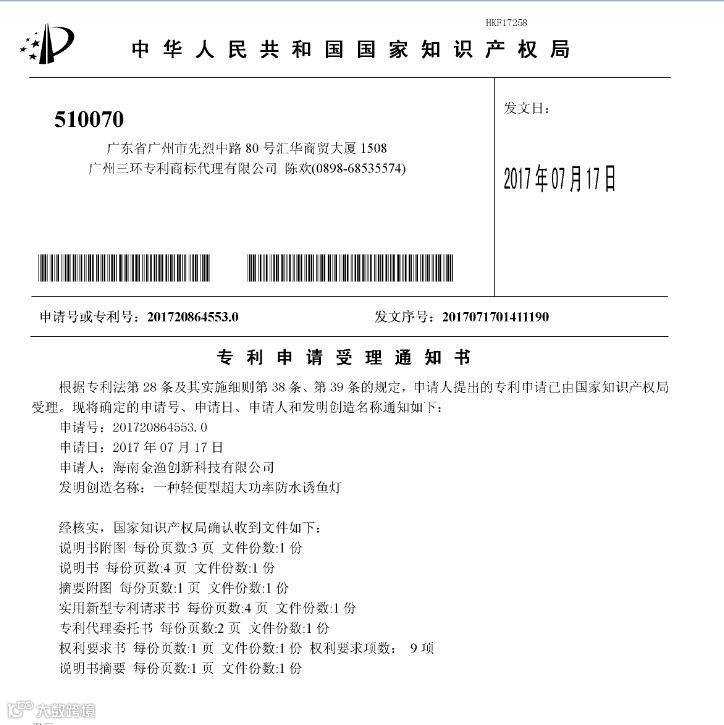 除了“专利证书”,在过去的一年,金渔创新科技一如既往不断精进技术进行研发创新,对传统的诱鱼灯不断改进,一种轻便型超大功率防水诱鱼灯成功获得由国家知识产权局颁发的实用新型专利证书,充分体现了金渔穿心科技自主技术研发团队的专业研发能力。