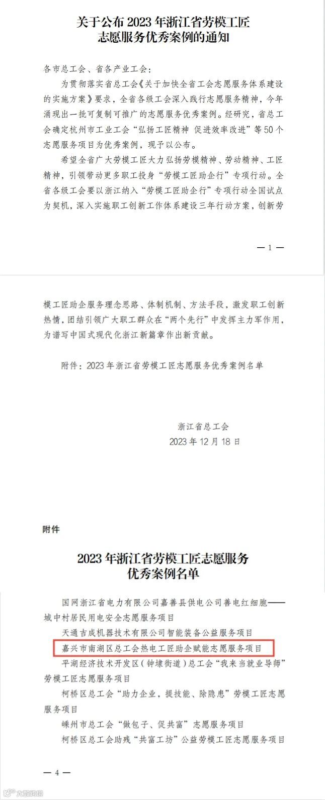 日前,浙江省总工会发文《关于公布2023年浙江省劳模工匠志愿服务优秀案例的通知》,全省50个志愿服务项目为优秀案例。嘉兴市共有4个志愿服务项目入围,其中南湖区总工会热电工匠助企赋能志愿服务项目榜上有名。