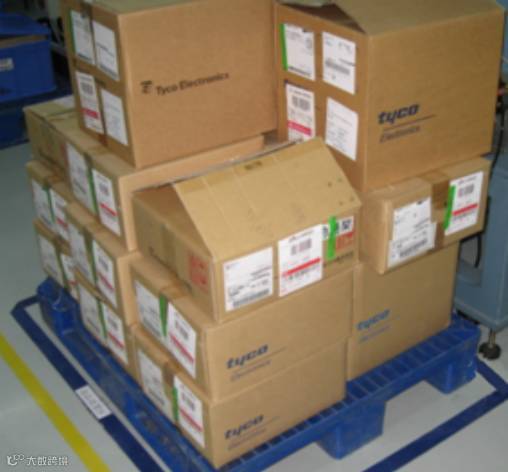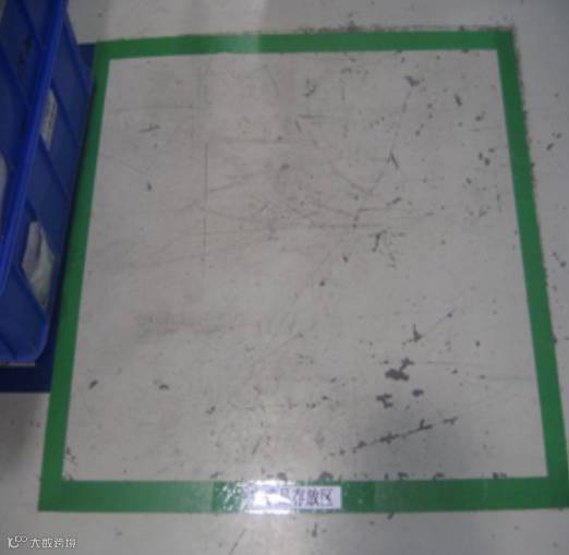 :对于“原材料区域”以及“进料接收区” ,使用蓝色胶带将四周进行标示,并用与胶带一样宽的白色标签标示,注明具体的放置物品。