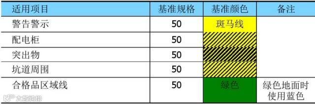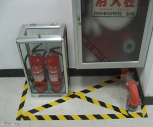 安全区域,例如灭火器放置区,控电箱区域等,在所要求的安全距离以外,用黄黑相间的胶带将四周做标示,并在区域内交叉做标示,以表明该区域任何时间不得被占用。