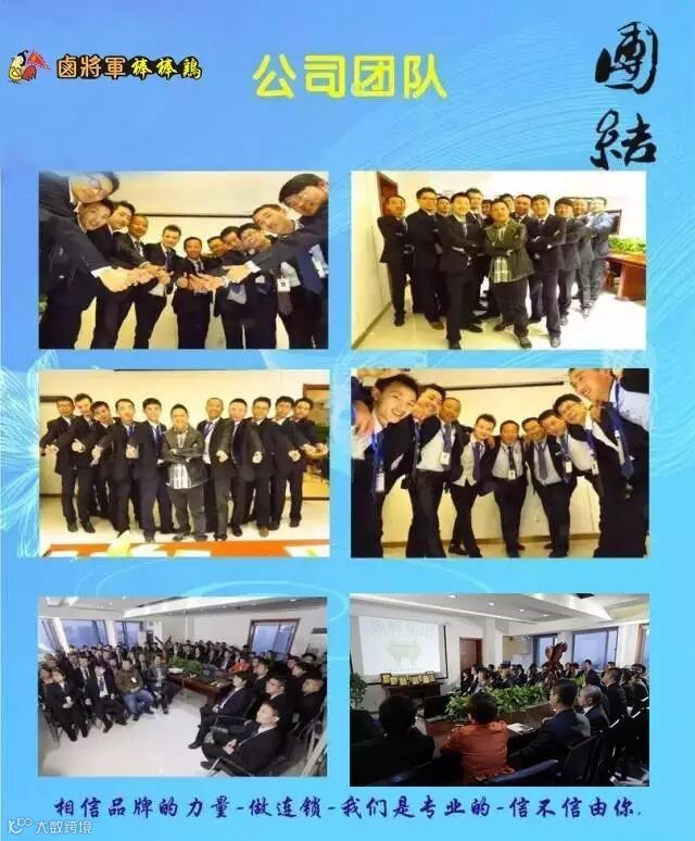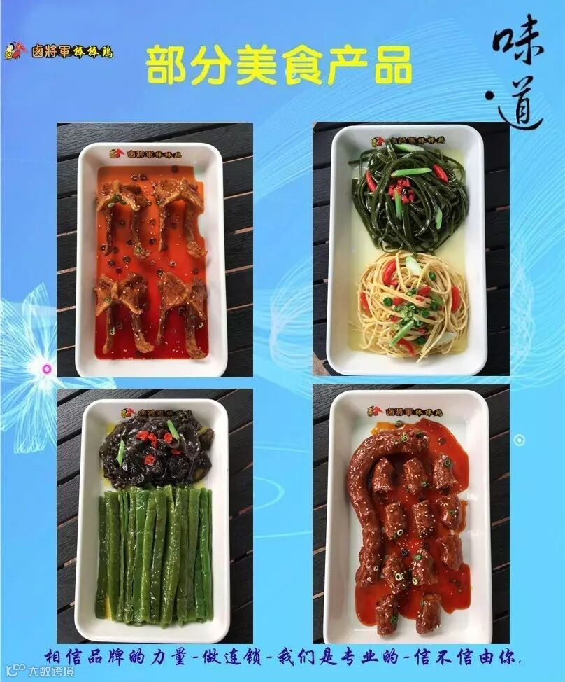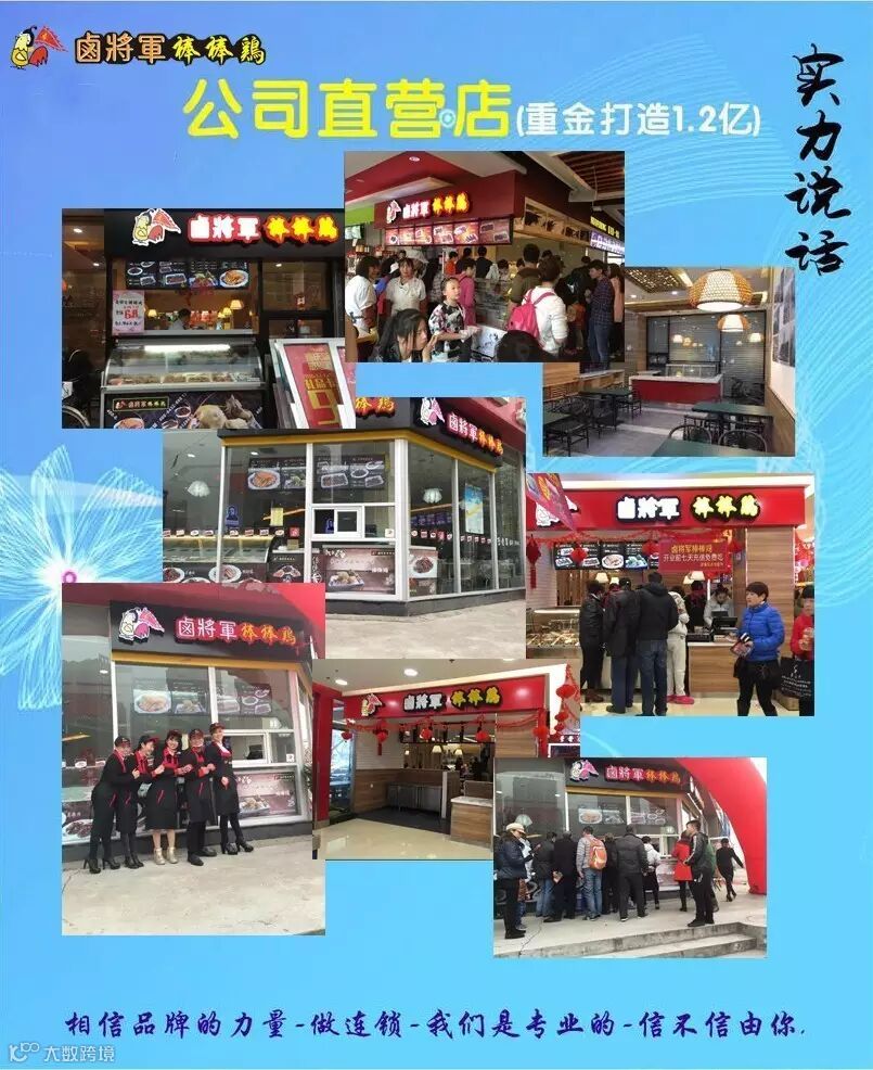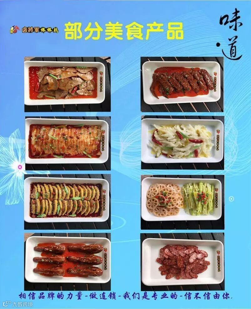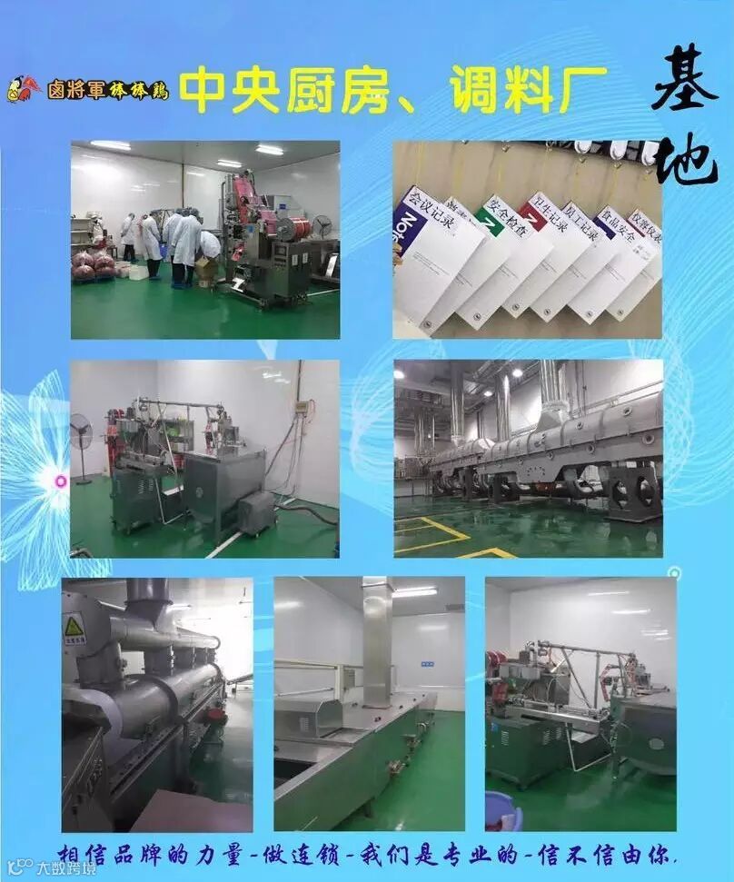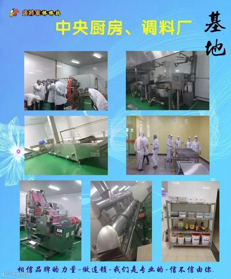 卤将军棒棒鸡自成立以来,本着传承经典美味,致力于发展为餐饮加盟龙头的目标而前进。从品牌到技术研发、从技术的标准化到服务标准化,从运营策划到店面统一装修等,卤将军棒棒鸡结合市场经营和品牌发展,把技术生产转化为营运管理,不断的创新研发新产品,在客户学习期间为客户手把手的传授培训知识,直至客户熟练的掌握标准流程。自棒棒鸡品牌成立以来,本着对加盟商负责的态度,总部既保证了所有品牌“千店一味”的菜品质量和“千店一样”的服务质量,又保证了加盟商的良好运营和终端获利。