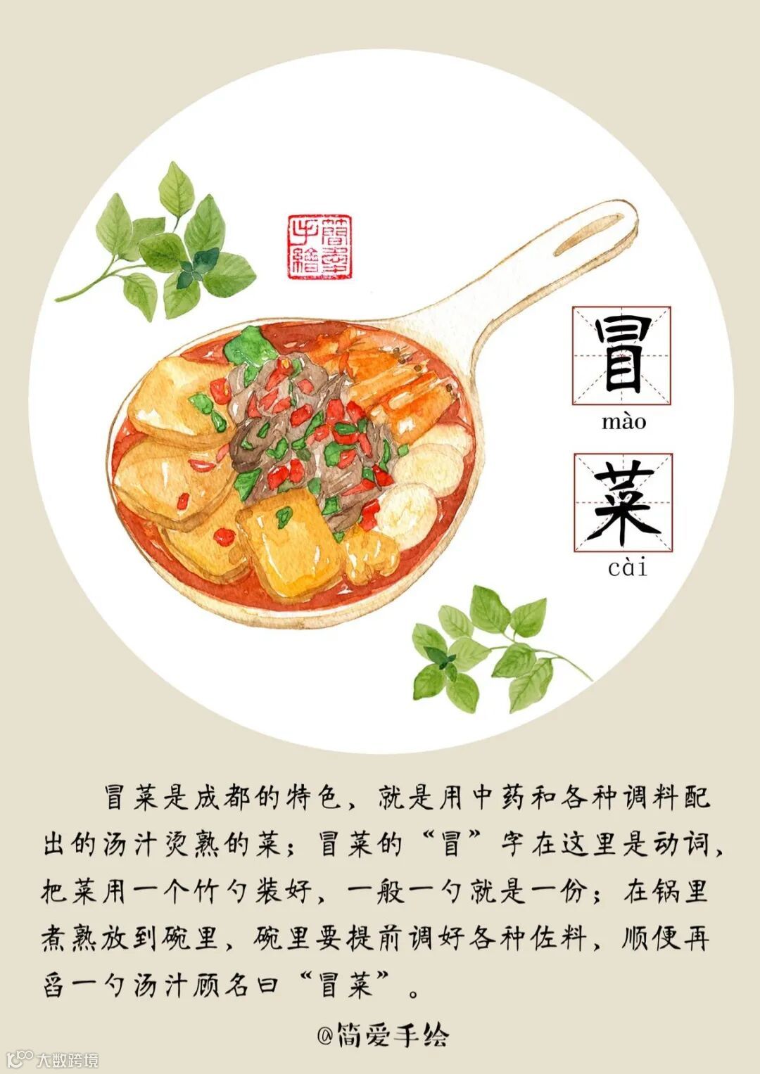 将煮熟的菜放入大碗中,碗里提前调好各种佐料,顺便再舀一勺汤汁,再撒上点香菜、葱花和四川特有的豆豉,就成了成都最有名最特色的小吃“冒菜”。