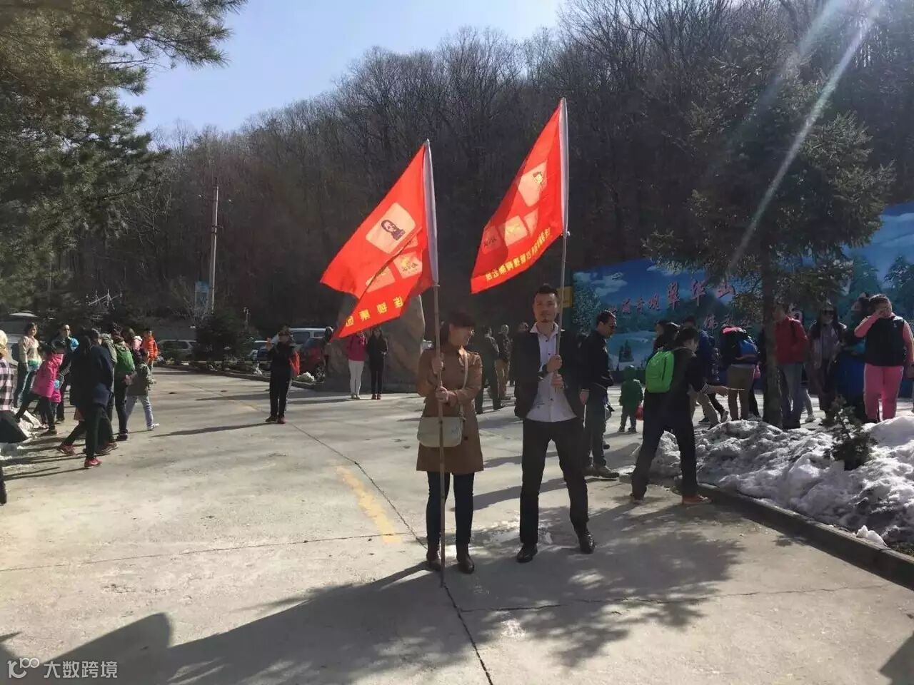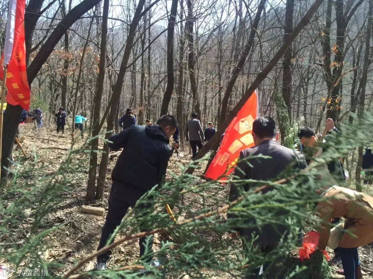 山坡上,红旗招展,我们选好了植树造林的好战场。有的拿着锄头挖树坑;有的用铁锹铲土;有的搬小树苗;还有的拿着小桶到河边打水。她(他)们干得热火朝天,脸上红通通的……
