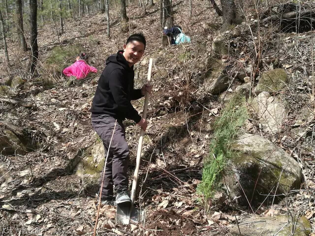 我们兴高彩烈地拿着植树的工具和小树苗,来到山坡上植树。