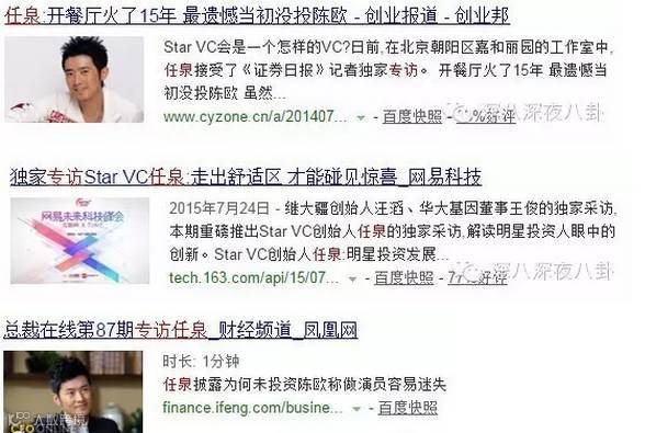 现在打开百度,搜“任泉专访”,密密麻麻全是来财经频道啊XX创始人啊总裁在线啊创业报道啊,这跨界跨得也真不是一星半点的