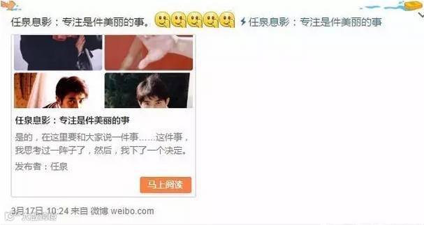 接着是昨天,任泉憋不住了,在微博上宣布息影,以后会专注搞投资,感觉他这个决定,憋了好久……毕竟他这些年的确没怎么在拍戏了