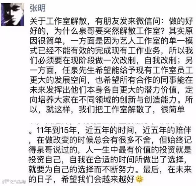 解散的时候,很多人都不解啊!!任泉工作室多能赚钱啊!怎么说解散就解散啊!!!后来工作室的总经理张明就发了朋友圈,说明为什么解散。其实简而言之就是:现在只是解散工作室,我们改头换面后就会回来