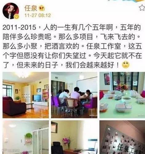 2011年任泉离开华谊,成立了自己的工作室。其实成立工作室这种事现在看起来很正常,多数是想更加专注地打理自己的演艺事业。黄晓明啊范冰冰啊李冰冰这些大咖都会开自己的工作室,现在连什么郑爽张檬唐嫣这些小花也弄了工作。。。顺便说一句,张檬你整成这样了为什么还好意思自拍。。。