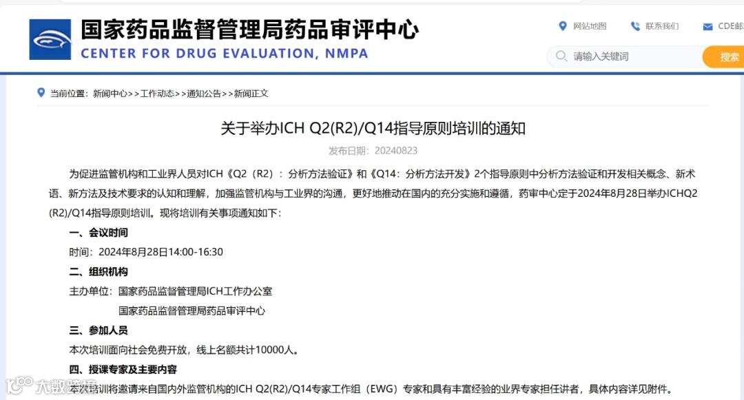为促进监管机构和工业界人员对ICH《Q2(R2):分析方法验证》和《Q14:分析方法开发》2个指导原则中分析方法验证和开发相关概念、新术语、新方法及技术要求的认知和理解,加强监管机构与工业界的沟通,更好地推动在国内的充分实施和遵循,药审中心定于2024年8月28日举办ICHQ2(R2)/Q14指导原则培训。现将培训有关事项通知如下:
