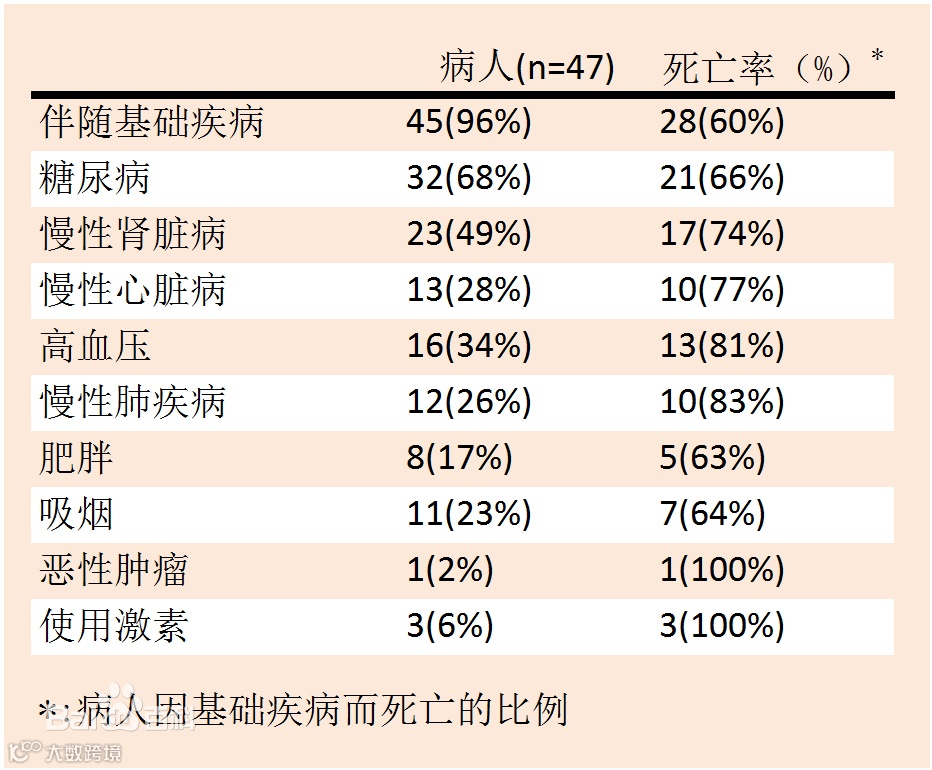 96%的患者既往基础疾病,糖尿病、慢性肾脏病、慢性心脏病、高血压是最常见的基础疾病。基础疾病与病死率关系可见图2: