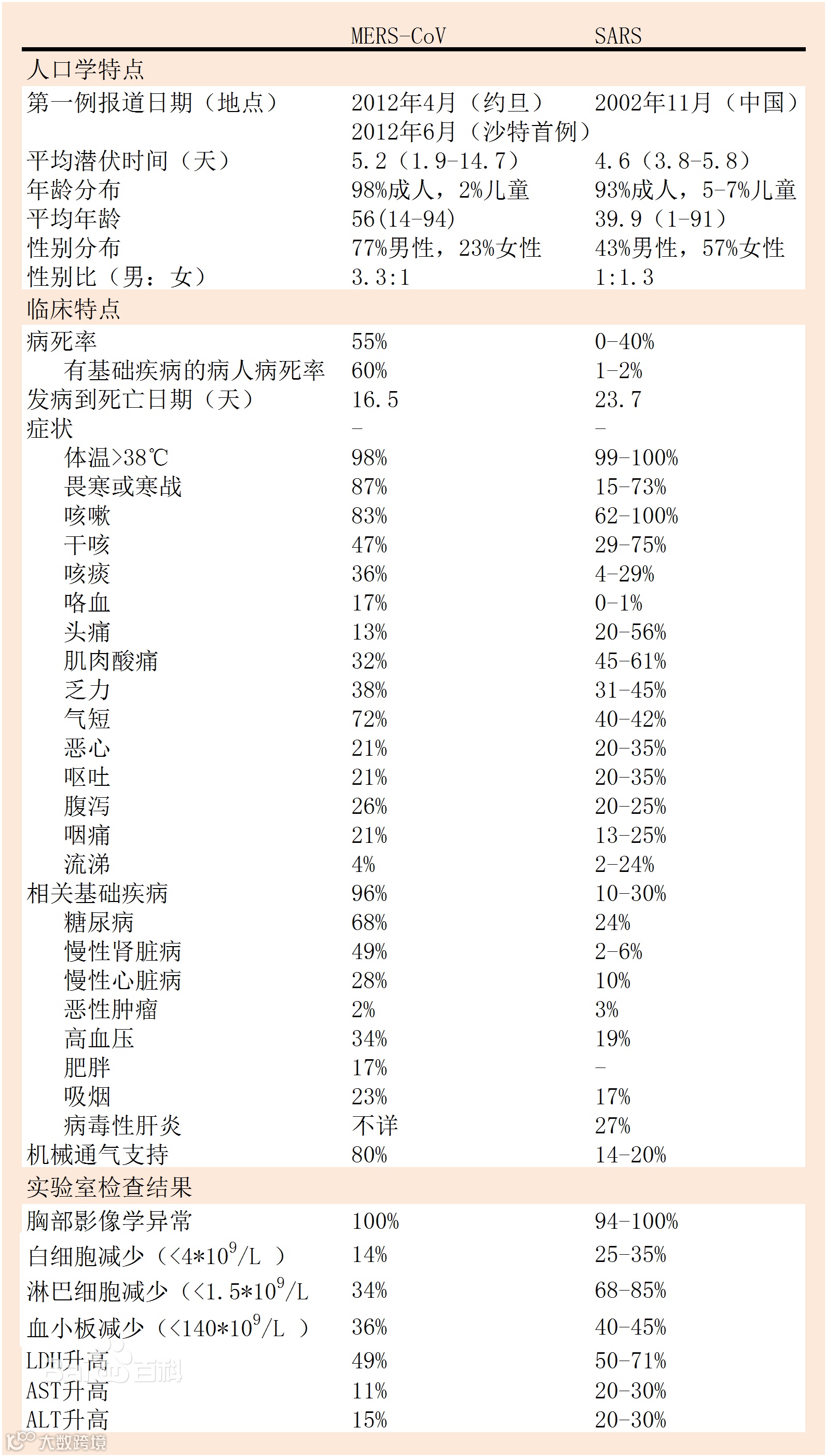 最近的讨论多集中在MERS与SARS在临床以及实验室的相似处上,这两种冠状病毒都会引起急性呼吸窘迫综合征,而2002年11月在中国南方爆发的SARS更为公众熟知。SARS自中国南方快速蔓延至中国香港,乃至全球,最终造成8422人患病,916人死亡(病死率约11%),MERS病死率更高。MERS在临床表现上与SARS有些相似之处,但仍存在很多不同(如图3):