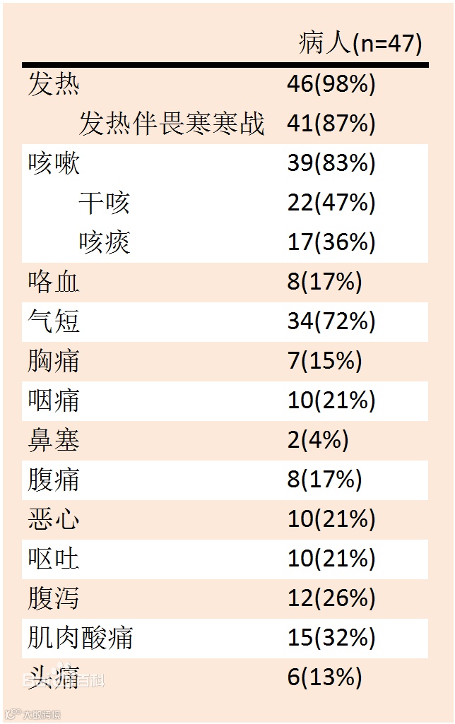 临床特点分析(如图1):中东呼吸综合征最常见的临床表现是发热、发热伴畏寒寒战、咳嗽、气短、肌肉酸痛。腹泻、恶心呕吐、腹痛等胃肠道表现也较为常见。