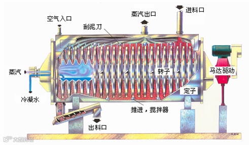 通过转盘边缘的推进/搅拌器的作用,污泥被均匀缓慢地输送通过整个干燥机,并通过与转 盘的热接触被干化。在干化过程中,热蒸汽冷凝在转盘腔的内壁上,形成冷凝水。冷凝水通过一个管子被导入 中心管,最终通过导出槽导出干燥机。在每两片转盘之间装有刮刀,刮刀固定在外壳(定子)上。刮刀可以疏松盘片间的污泥, 使废蒸汽快速离开污泥。