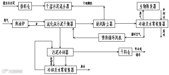 其工艺流程为:脱水后污泥部分送至流化床污泥干燥器的给料分配器中,另一部分送至一个污泥/粉尘混合器;在流化床的干燥器中污泥处于悬浮状态并得到干化。带有湿气及污泥细粒的气体被抽至旋风除尘器进行气固分离,最后气体回到干燥器中进行下一次的循环处理。干燥后的污泥排出经冷却后输送至料仓或外运。