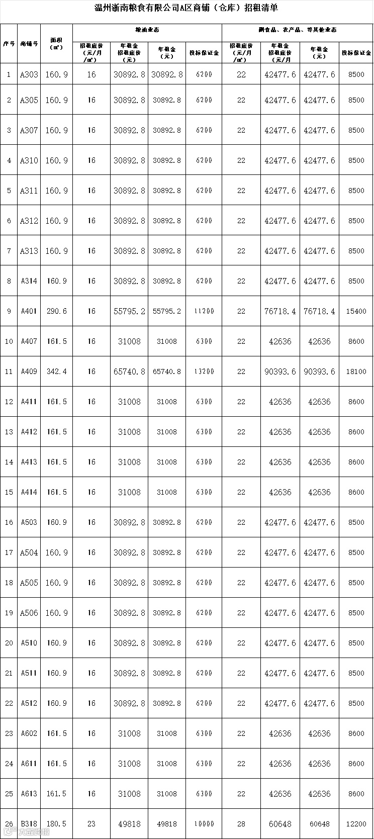 龙湾瑶溪白楼下温州粮食中心市场内A、B区共计26间商铺(具体商铺(仓库)号、面积、招租价格等见附件名单)。