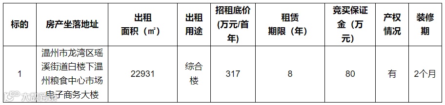 现委托温州联合产权交易中心有限公司,通过“浙交汇”平台对以下标的租赁权进行“网络动态报价”式交易,于2025年12月24日至2026年1月7日开始自由报价,2026年1月8日10时整开始限时报价,具体事宜详见“浙交汇”网站项目信息披露。