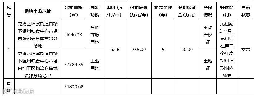 2.竞得人须在成交之日起7个工作日内将首年租金及履约保证金足额缴至温州联合产权交易中心账户(户名:温州联合产权交易中心有限公司,账号:756000120190008655,开户行:温州银行城西支行);并在收到《租赁资产移交通知书》的7个工作日内与出租方签订《租赁合同》,办理标的移交手续,租期从签订《租赁合同》后的约定之日开始计算。