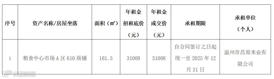 本公司温州粮食中心市场A区610商铺资产经市评估机构评估,按相关程序审批,现将出租结果公示如下:
