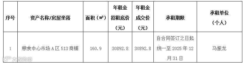 本公司温州粮食中心市场A区513商铺资产经市评估机构评估,按相关程序审批,现将出租结果公示如下: