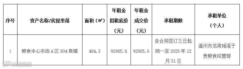 本公司温州粮食中心市场A区804商铺资产经市评估机构评估,按相关程序审批,现将出租结果公示如下: