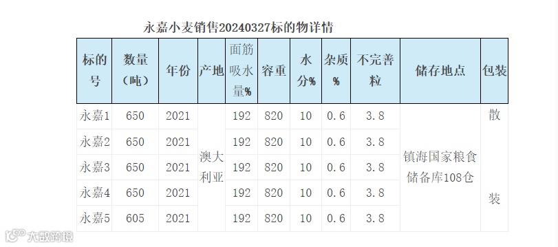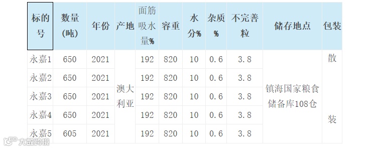 1.品种:白小麦;年份:2021;产地:澳大利亚;数量:3205吨,5个标段(详见标的物详情)。