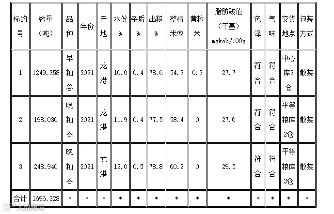 1.品种:早晚籼稻谷,时间:2021年;数量:1693.328吨;3个标段。