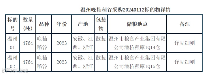 (一)品种:晚籼稻谷;粒型:长粒型;数量:9528吨;生产年份:2023年;产地:安徽、江西、浙江。设2个标的,仓房为温州市粮食产业集团有限公司潘桥粮库1Q14、1Q15仓,仓容安排可按储运公司实际情况协商调整。