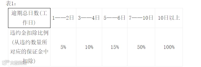 (二)交货期限:在2024年3月31日前完成交货(由不可抗力情况所导致的交货延期除外),否则视作逾期供货。逾期供货10个工作日以内的,按表1比例及逾期数量扣除相应保证金。