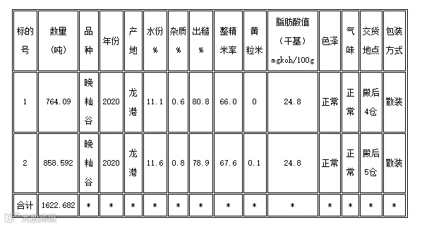 1、品种:晚籼稻谷,时间:2020年;产地:本地;数量:1622.682吨;2个标段;